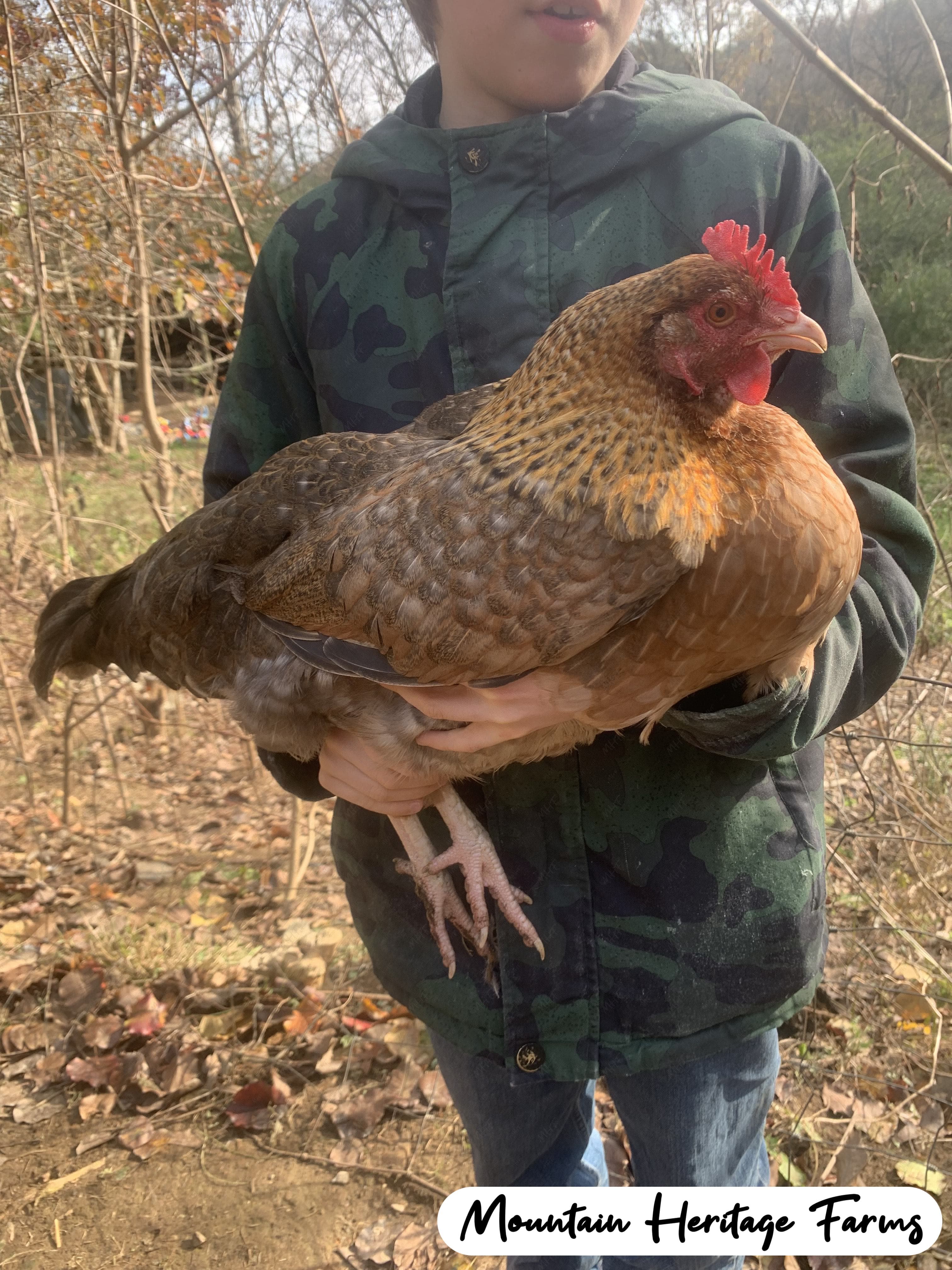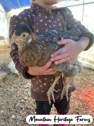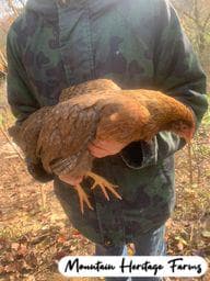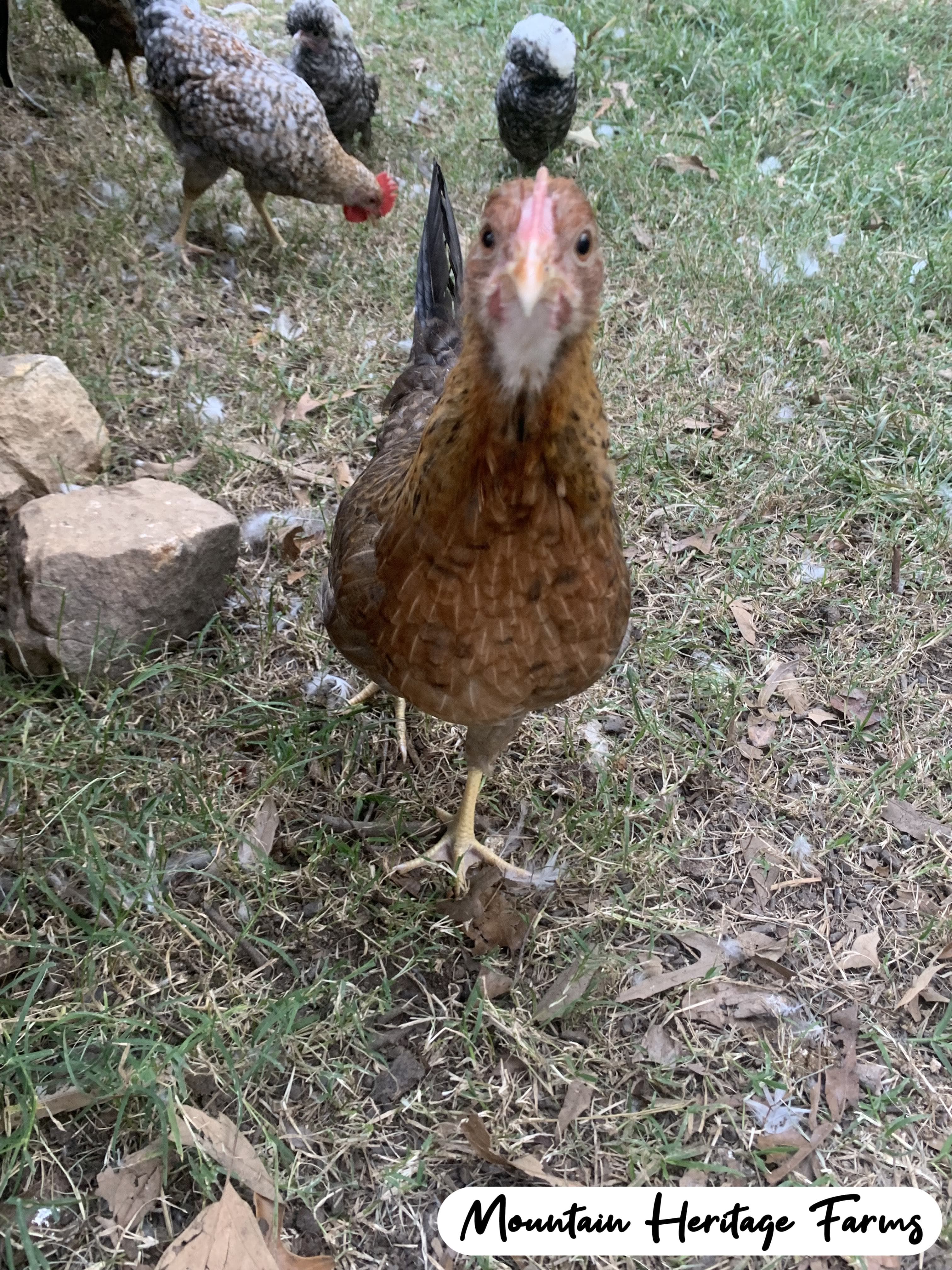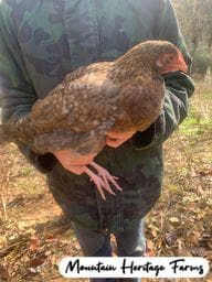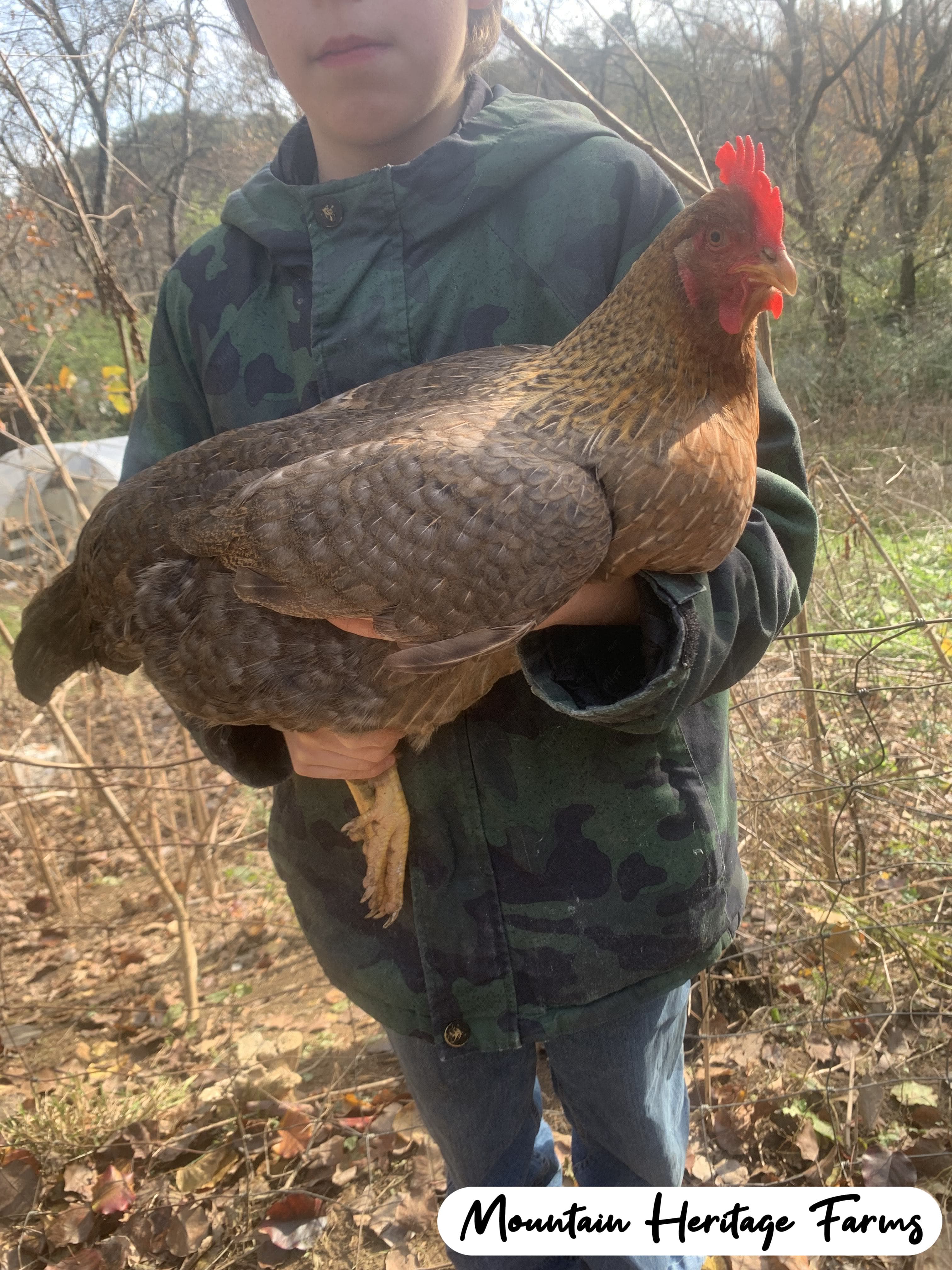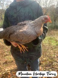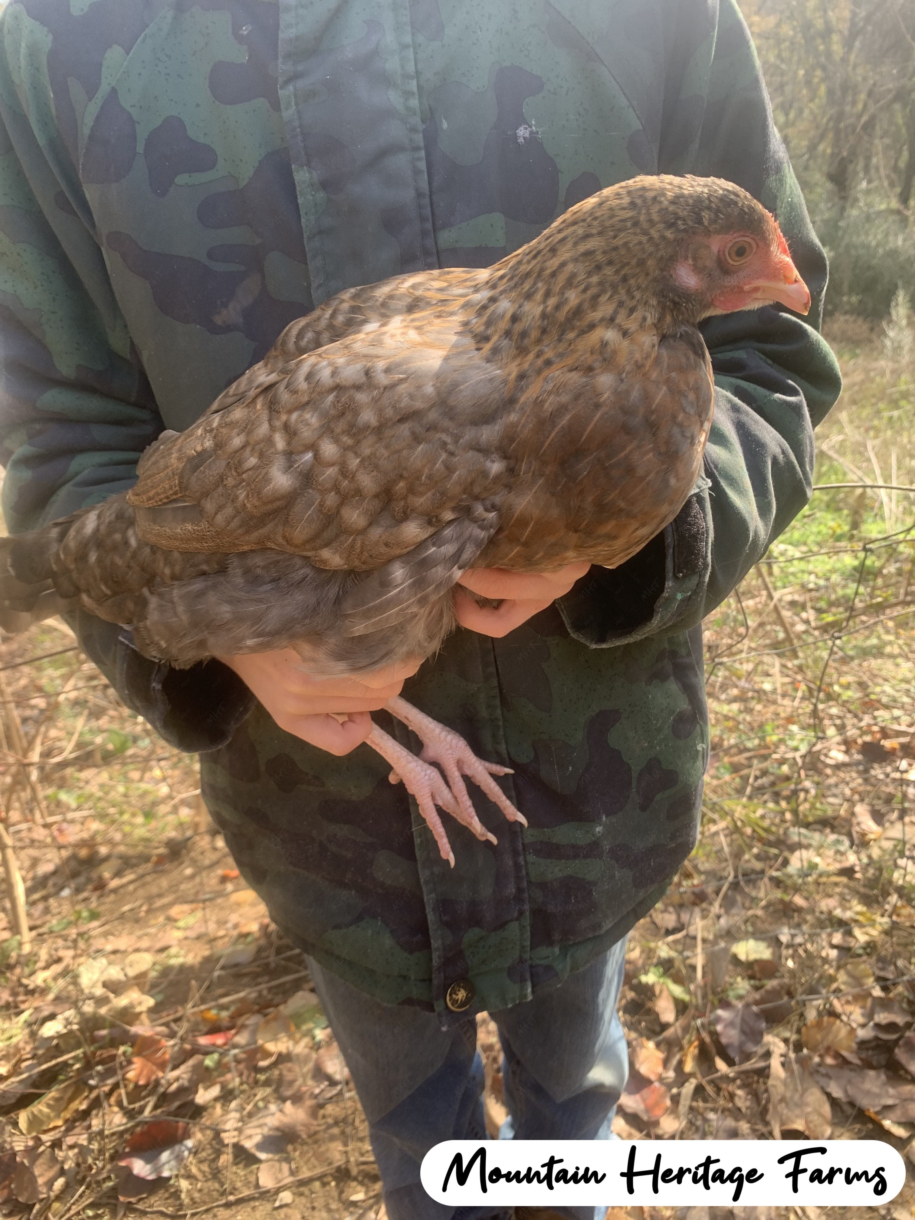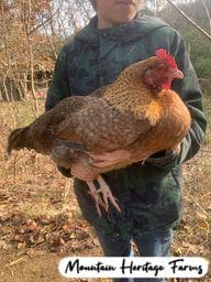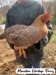 Exclusive hybrid developed by Mountain Heritage Farms from multiple heritage breeds. Designed to be a highly productive, autosexing, genetically diverse, and resilient egg layer for both beginners and seasoned keepers.