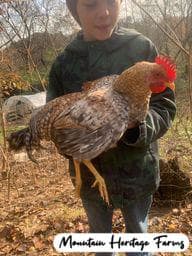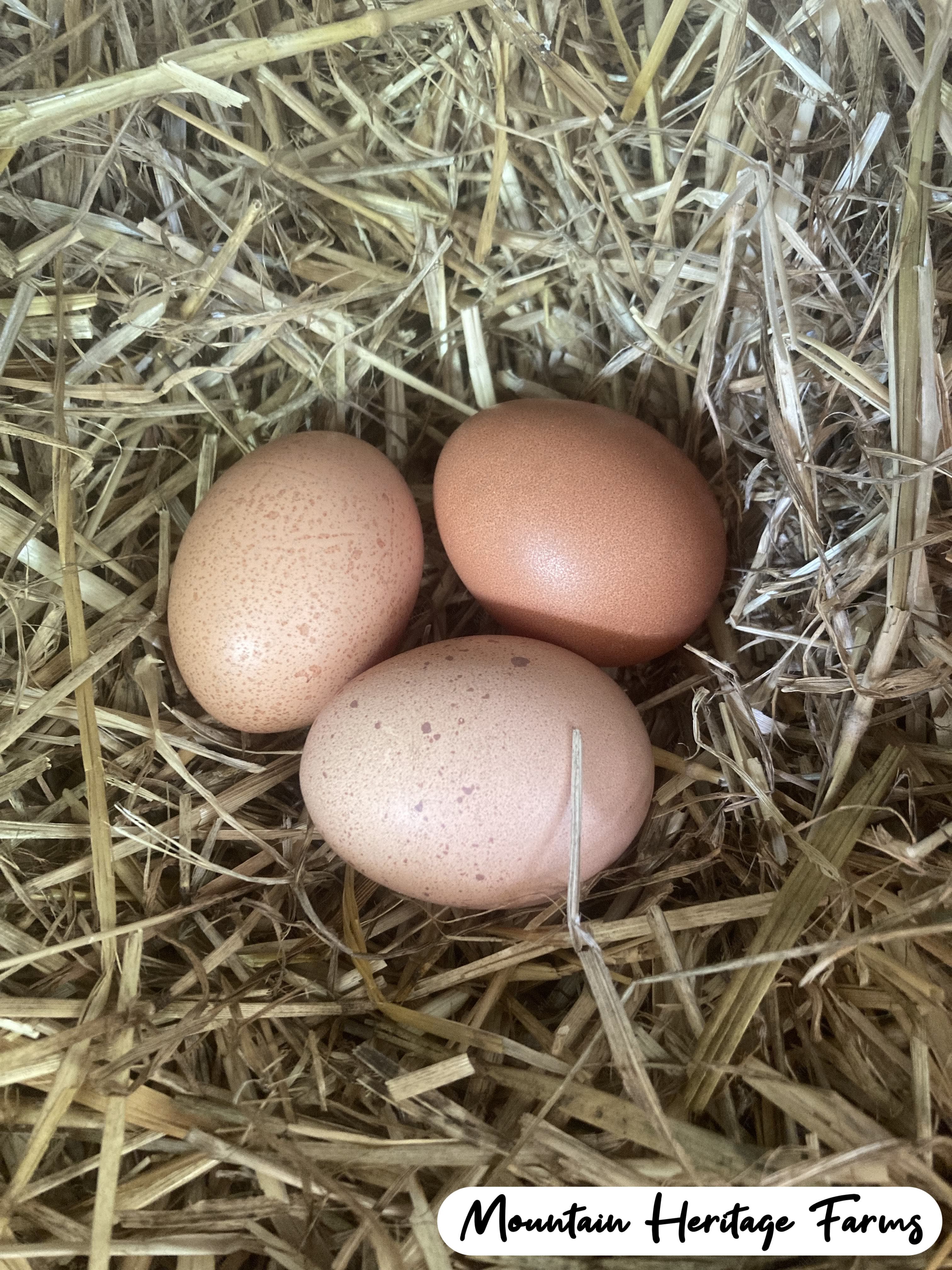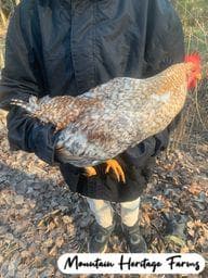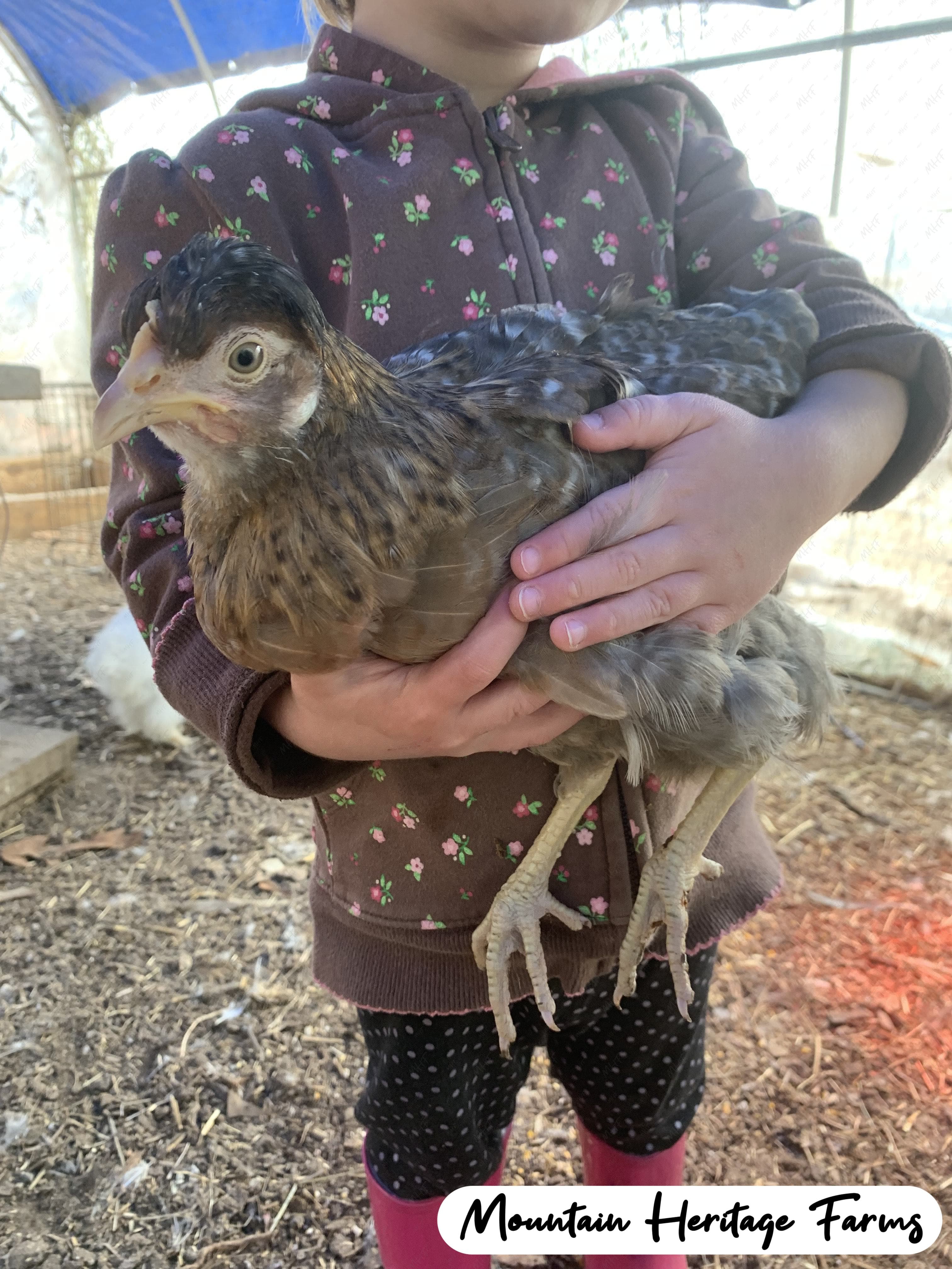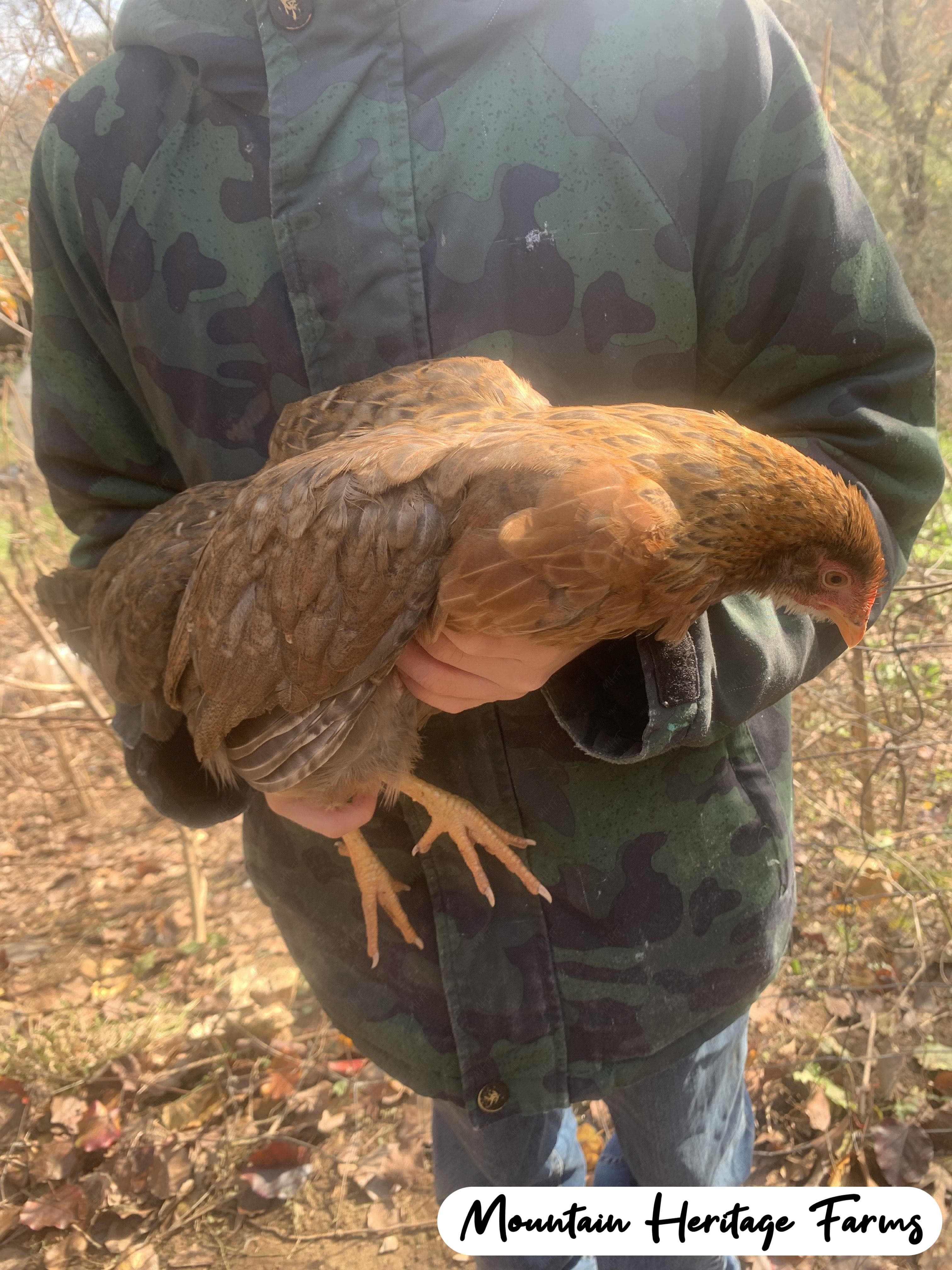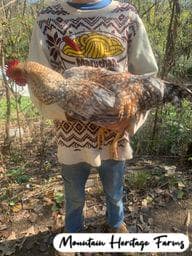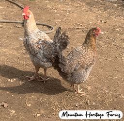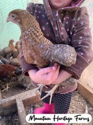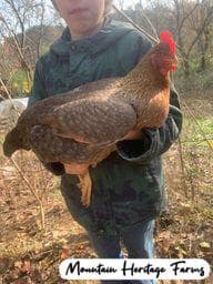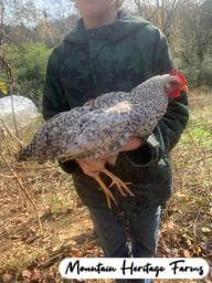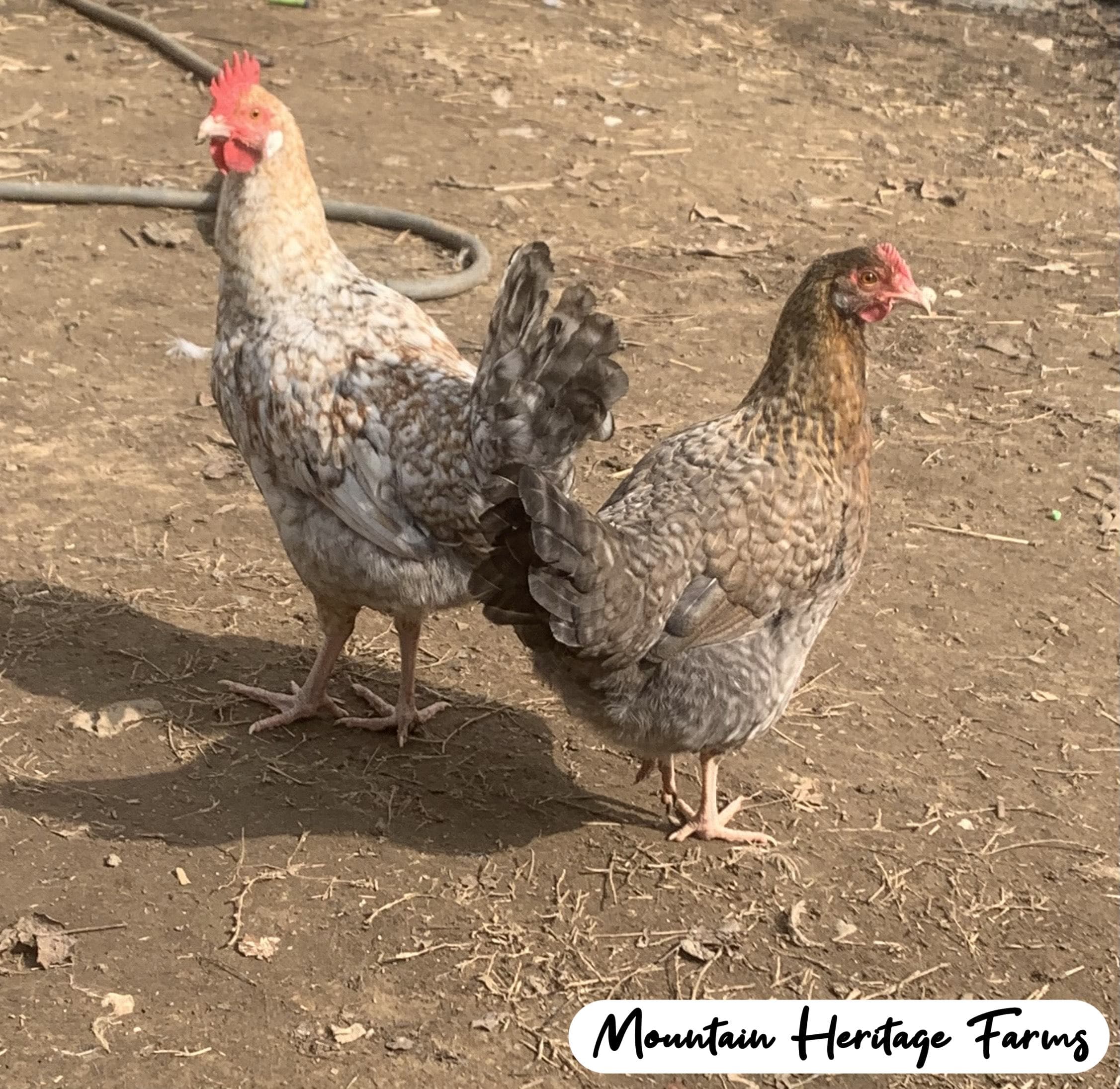 Exclusive hybrid developed by Mountain Heritage Farms from multiple heritage breeds. Designed to be a highly productive, autosexing, genetically diverse, and resilient egg layer for both beginners and seasoned keepers.